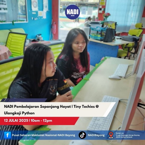 Pada 12 Julai 2025, NADI Bayong telah mengadakan program TINY TECHIES-ULANGKAJI PYTHON yang berlangsung pada pukul 10.00am sehingga 12.00pm. Program ini telah dihadiri oleh 3 orang peserta.