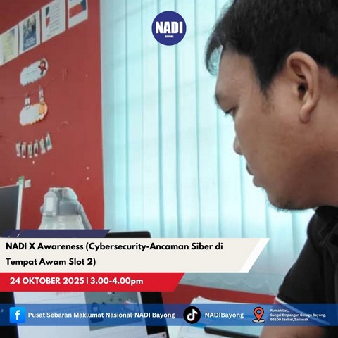 25 Oktober 2025 | Aktiviti TerkiniPada 24 Oktober 2025, NADI Bayong telah mengadakan program NADI X AWARENESS-Cybersecurity (Ancaman Siber di Tempat Awam Slot 2). Tujuan program ini diadakan adalah bertujuan untuk memberi kesedaran kepada peserta akan ancaman-ancaman yang boleh berlaku jika tidak mengamalkan keselamatan Ketika menggunakan internet.